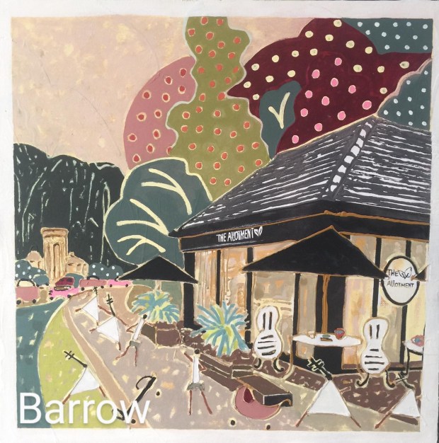 After 3 years in the making I have finally finished the ‘Allotment painting.’ This gem of a cafe is situated just in front of the plantation gates, Wigan. A delightful and welcoming place.